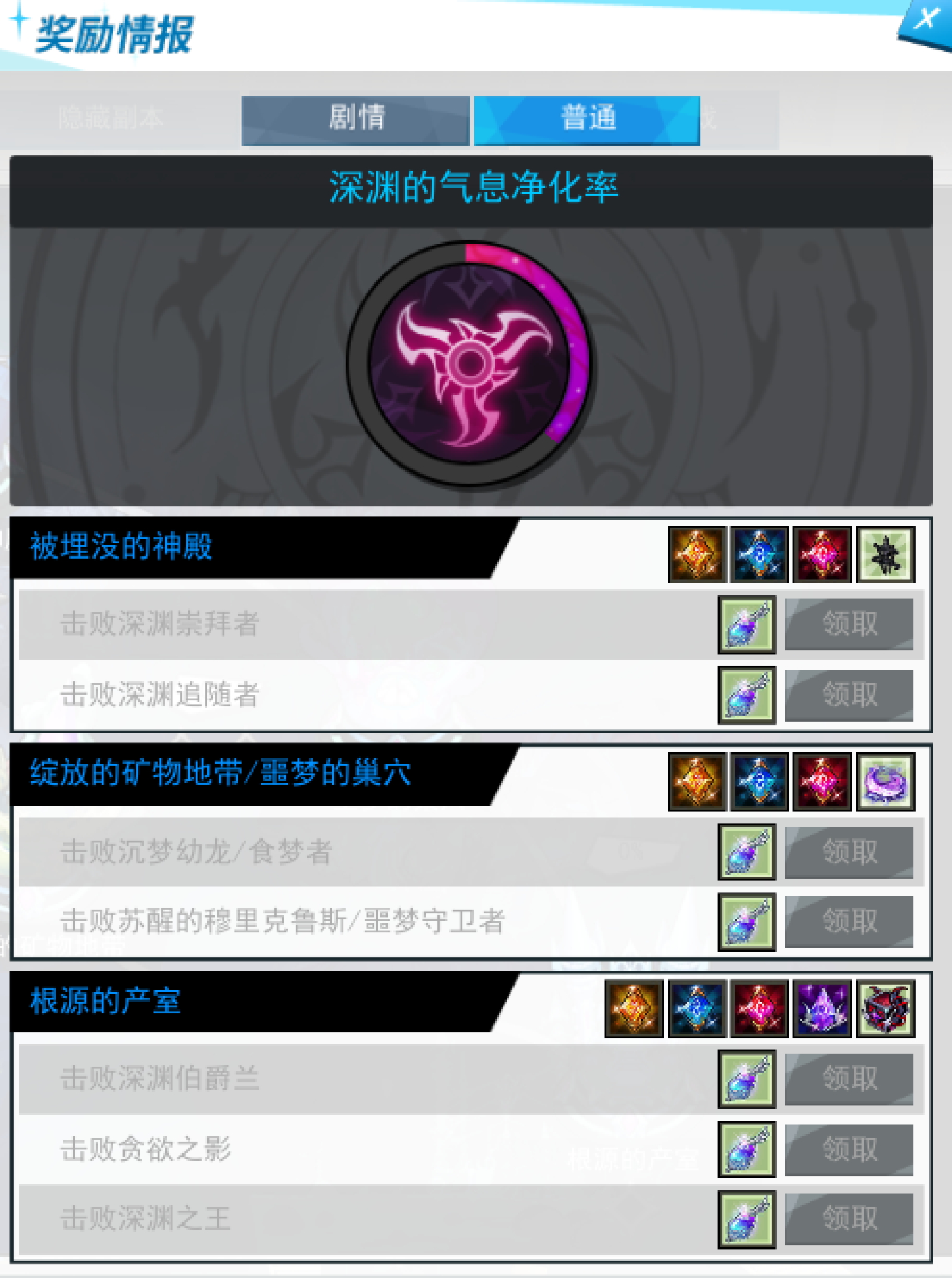 2)通关各个阶段后,点击“奖励情报”窗口的“领取”按钮时,可以获得提高净化率的“深渊的气息净化剂”。